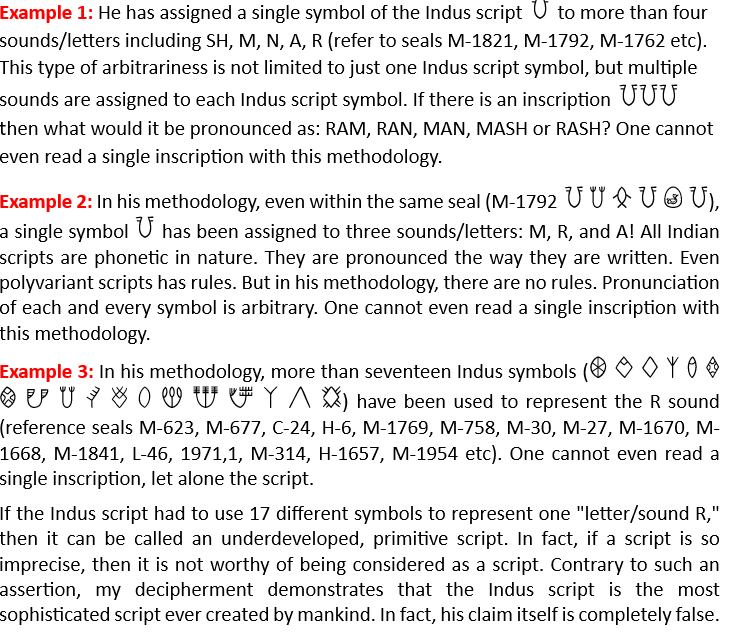 If the Indus script had to use 17 different symbols to represent one “letter/sound R,” then it can be called an underdeveloped, primitive script. In fact, if a script is so imprecise, then it is not worthy of being considered as a script. Contrary to such an assertion, my decipherment demonstrates that the Indus script is the most sophisticated script ever created by mankind. In fact, his claim itself is completely false.